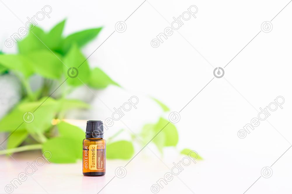 Turmeric 15 ml essential oil on white background with Volo Diffuser and plant leaves. Blank space can be used to add text or high resolution image can be cropped creatively for Instagram, Facebook, or social media.
