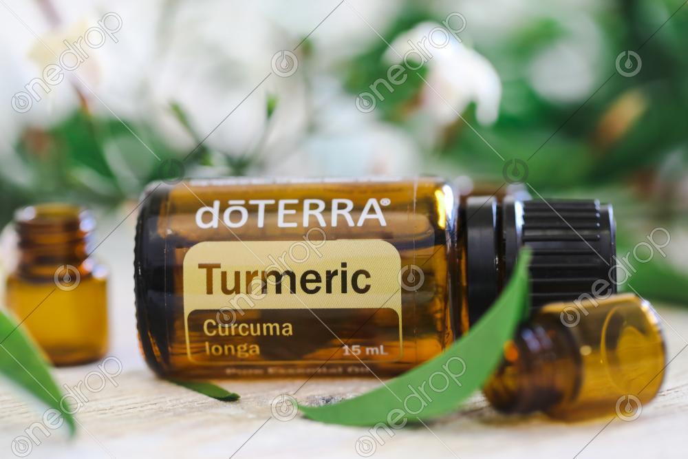 High resolution image of Turmeric close up with sample drams and fresh leaves