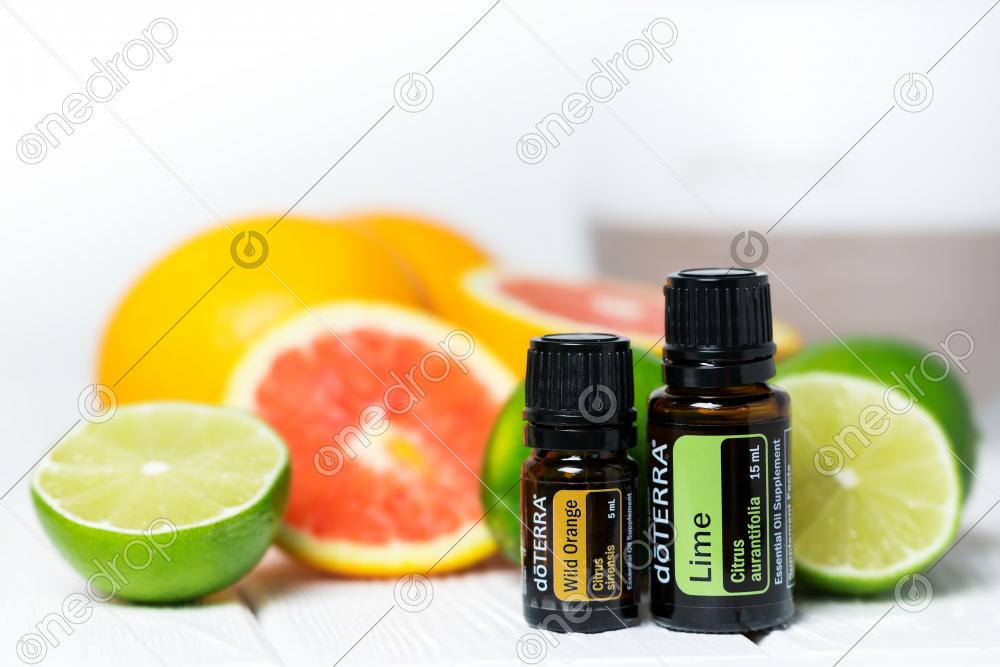Two Bottles of essential oils - Wild Orange and Lime closeup on white wooden