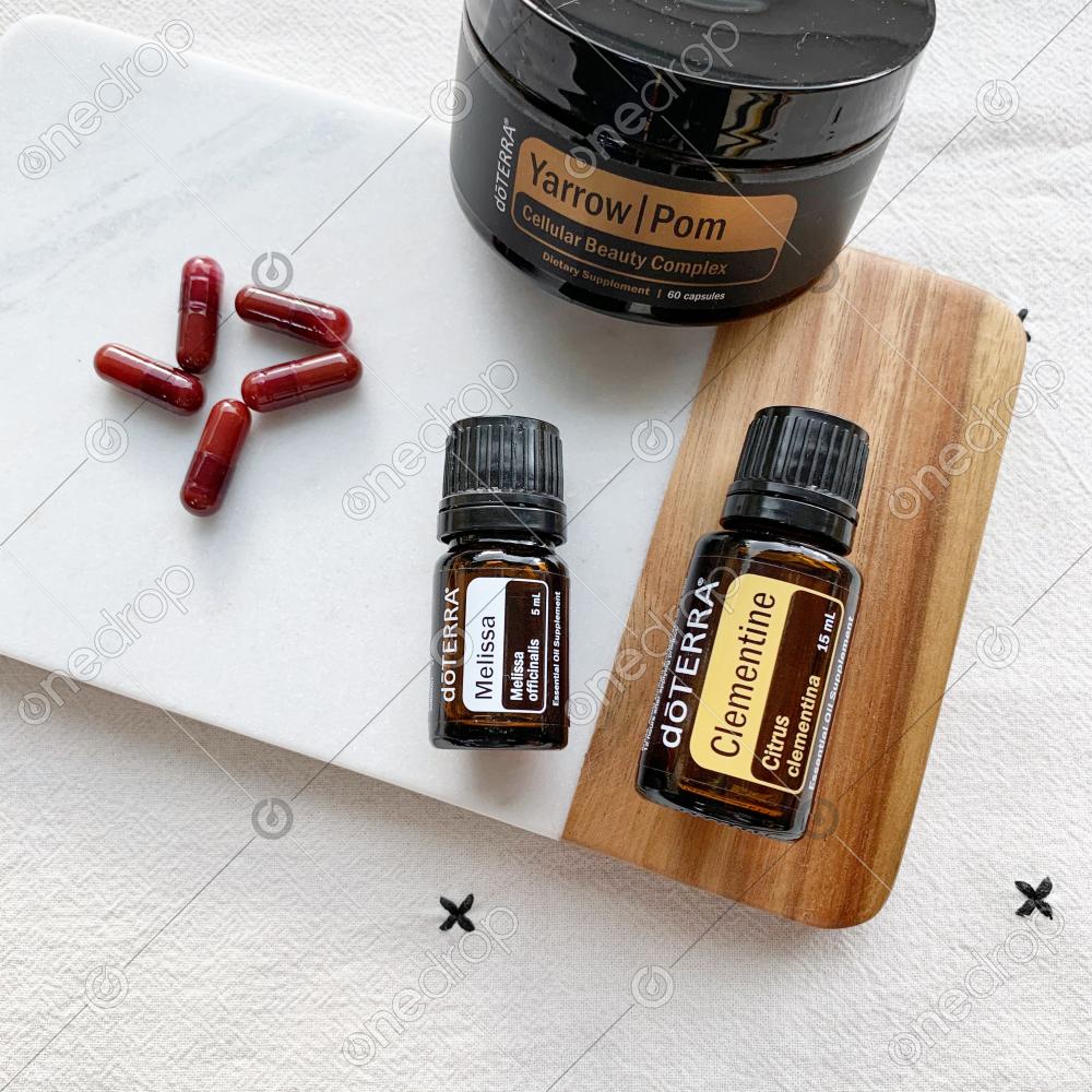 Features Clementine (15ml), Melissa (5ml), & Yarrow/Pom Cellular Beauty Complex in a Flat Lay.