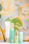 Veráge® Skin Care Collection on yellow flower background with yellow flowers and leaves. Blank space can be used to add text or high resolution image can be cropped creatively for Instagram, Facebook, or social media.