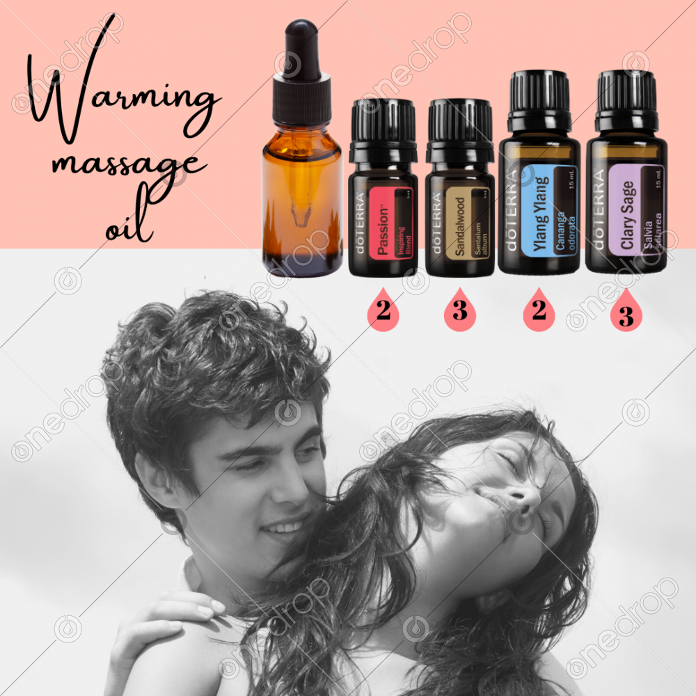 In a 2 oz glass bottle, combine oils and fill with a carrier oil. Use as a massage oil to warm the body temperature and create arousal.