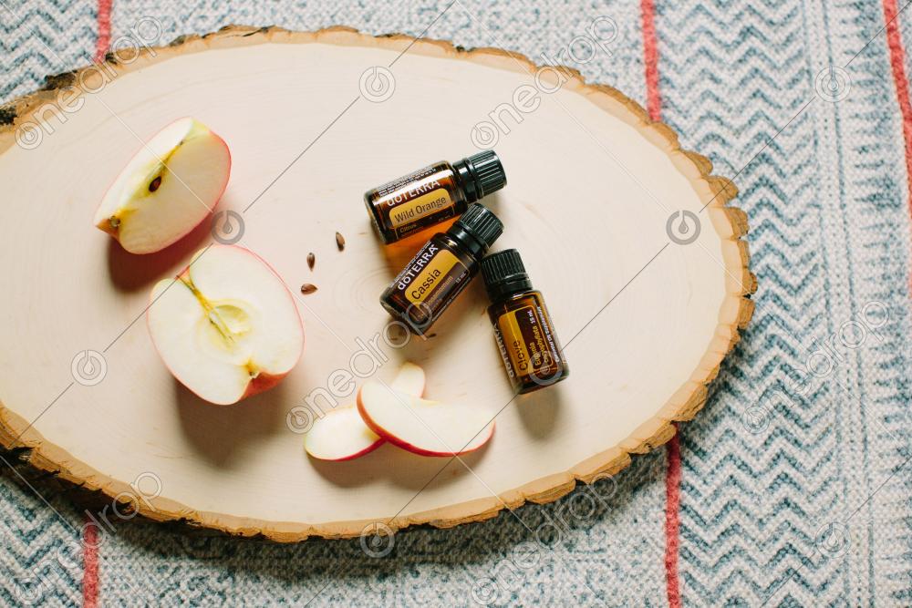 High-resolution photograph of Cassia, Wild Orange and Clove essential oils with apple slices on wood. Horizontal orientation with room for text if desired.
