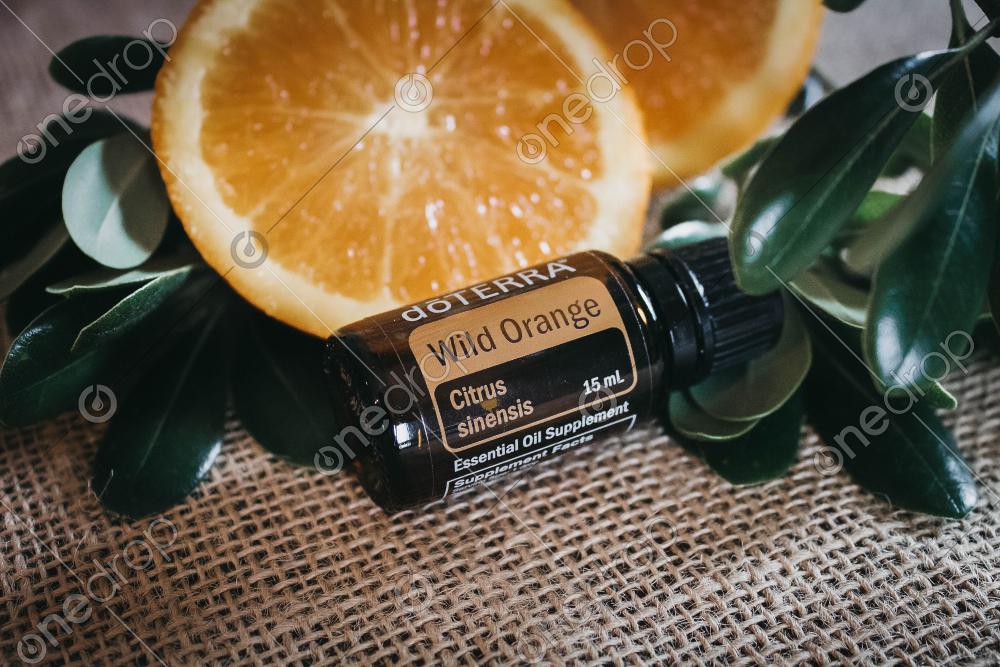 This photo features a 15 ml bottle of Wild Orange with orange slices and greenery on burlap