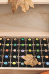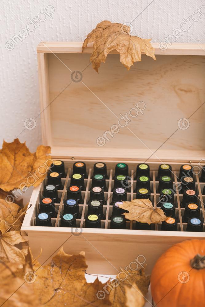 Wooden storage box with essential oils in fall cozy home interior. Collection decorated maple leaves and pumpkins