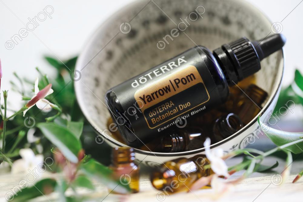High resolution image of Yarrow Pom in bowl with sample drams and fresh flowers