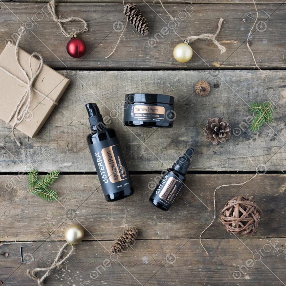 Yarrow | Pom Set layflat on rustic wood with Holiday Decor