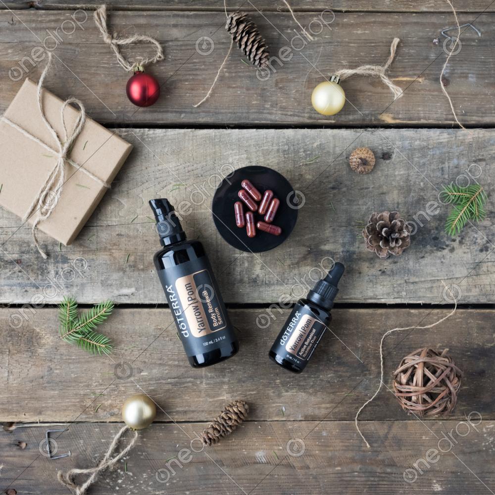 Yarrow | Pom Set layflat on rustic wood with holiday decor