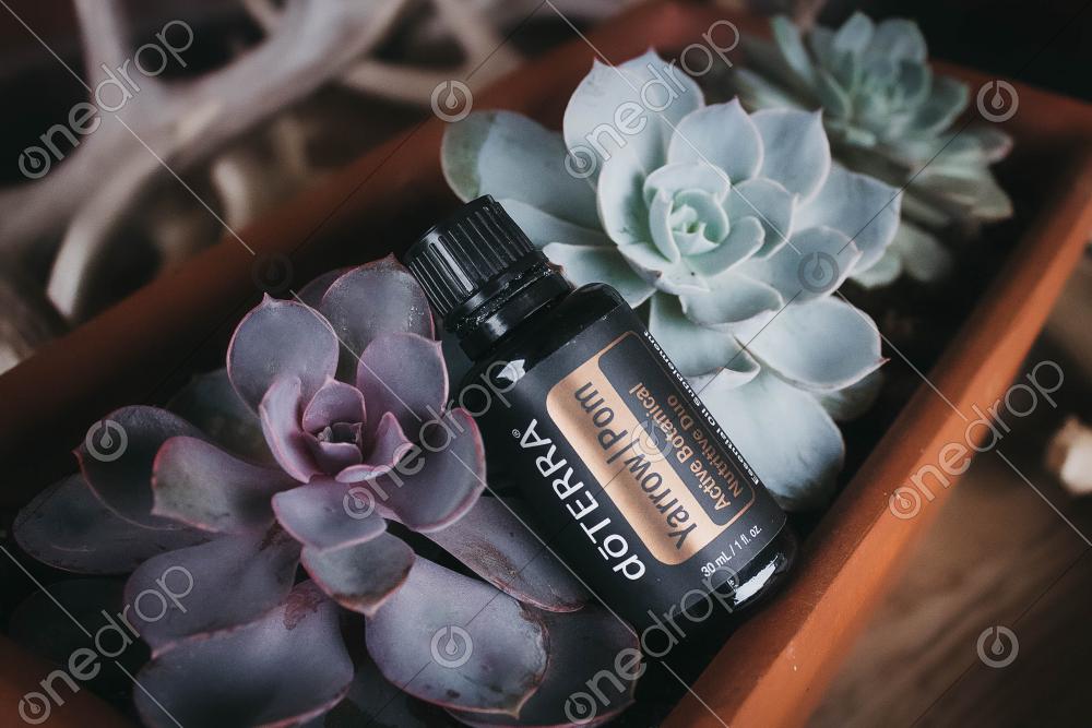 This photo features a 30 ml bottle of Yarrow|Pom with succulents and deer antlers in the background