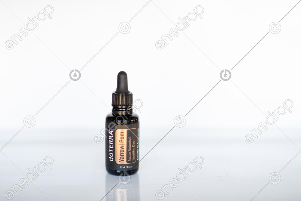 Yarrow|Pom bottle stands on a reflective white background.