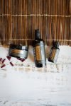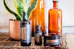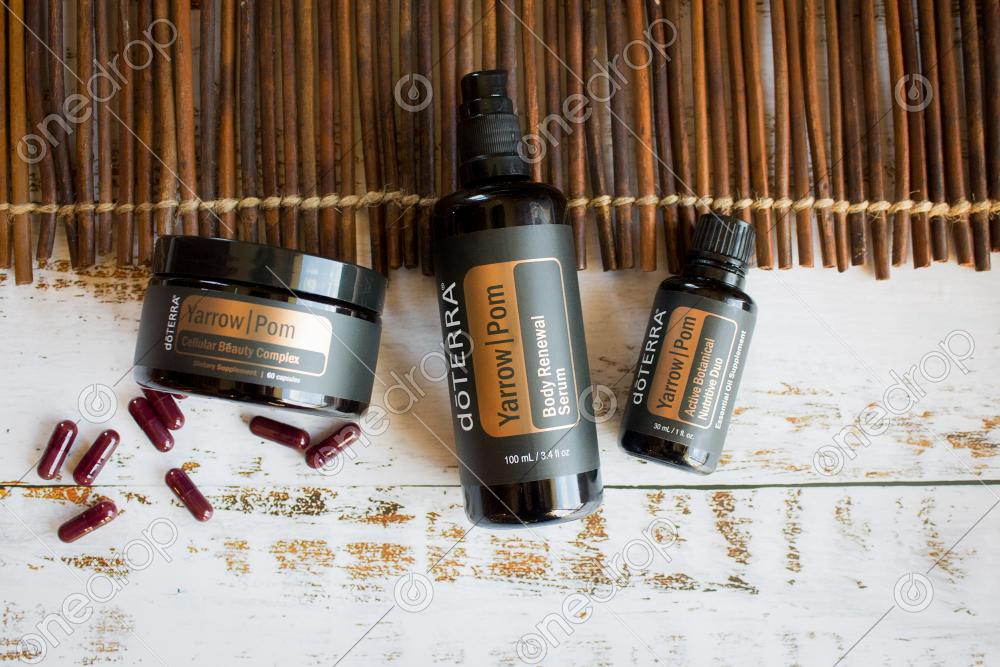 These images feature a 30 ml bottle of Yarrow|Pom essential oil, a 100 ml bottle of Yarrow|Pom Body Renewal Serum, and a 60 count jar of Yarrow|Pom Cellular Beauty Complex supplement with rustic background, plants, amber bottles, wood, and ship lap. Multiple sizes for social media, and white space for added text if you choose