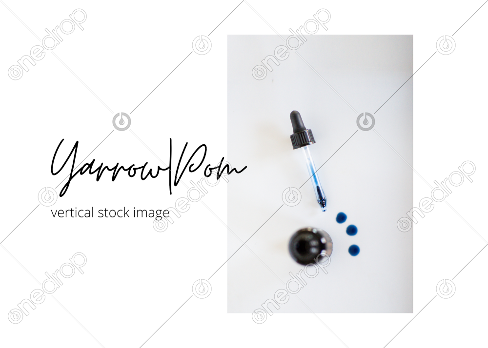 The Yarrow|Pom bottle stands on a reflective background with three drops of oil and the dropper top laying on its side.