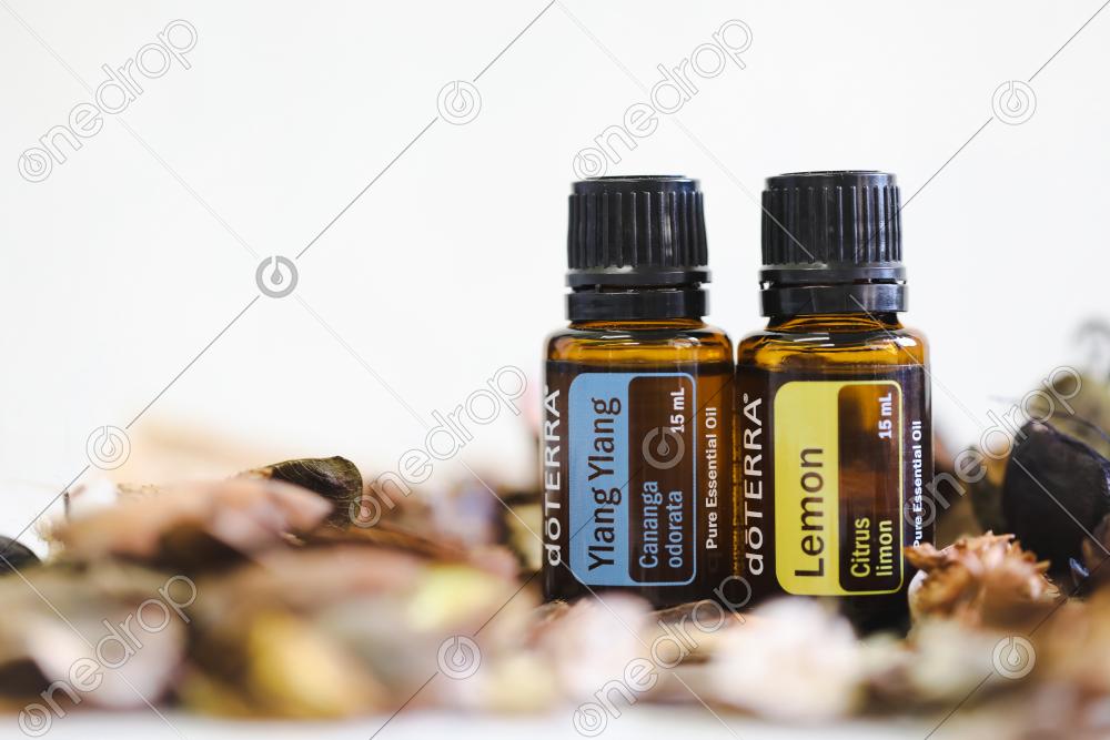 Ylang Ylang and Lemon in dried flowers with copy space