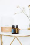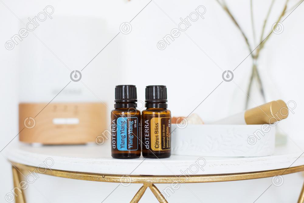 Styled product photo of Ylang Ylang and Citrus Bliss essential oils sitting on a white desk. Energizing and uplifting diffuser blend.