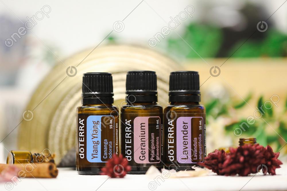 Ylang Ylang, dōTERRA Lavender and Geranium in pretty setting with gold rainbow