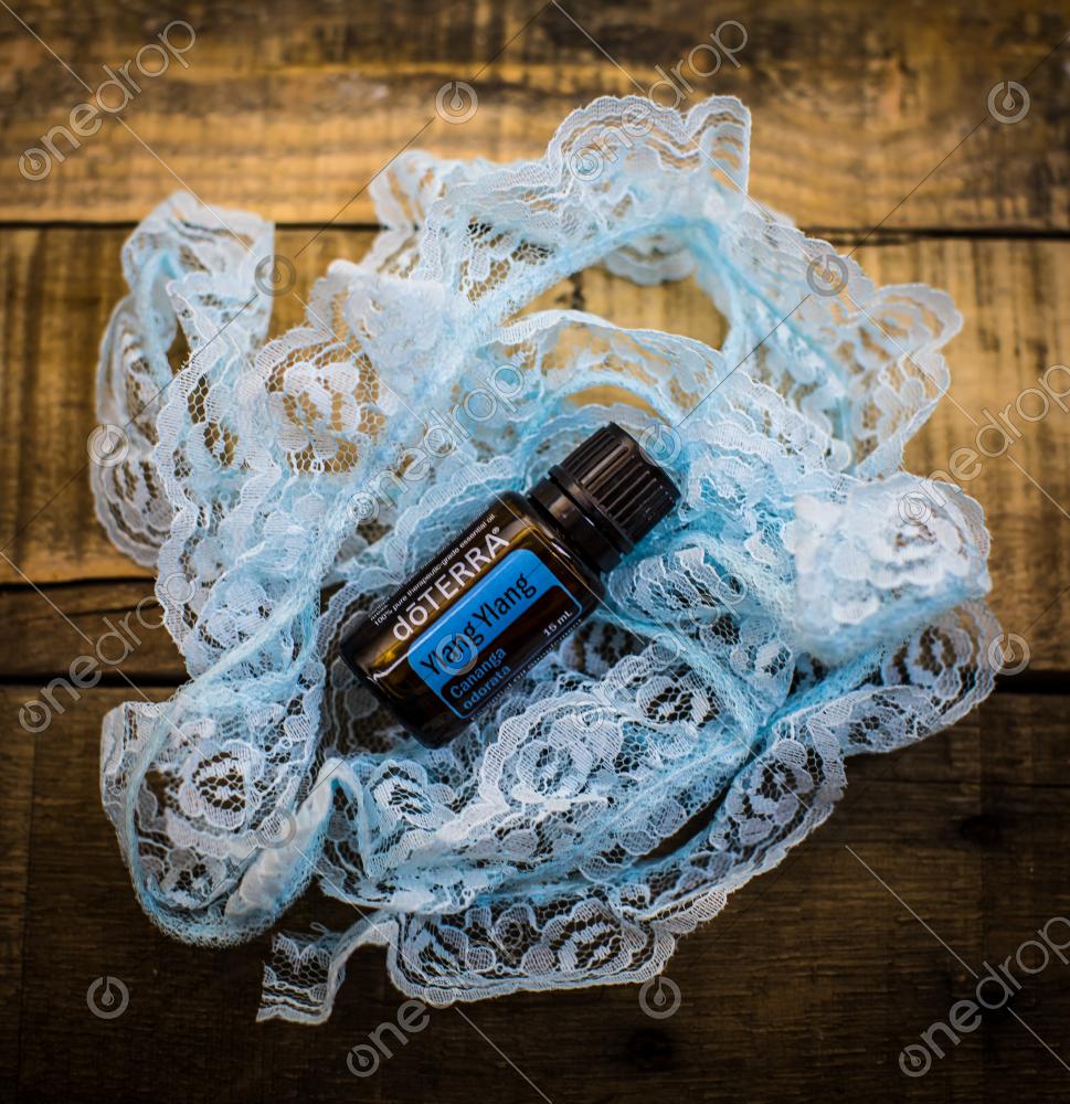 High Resolution image of Ylang Ylang oil with blue lace and rustic wood.