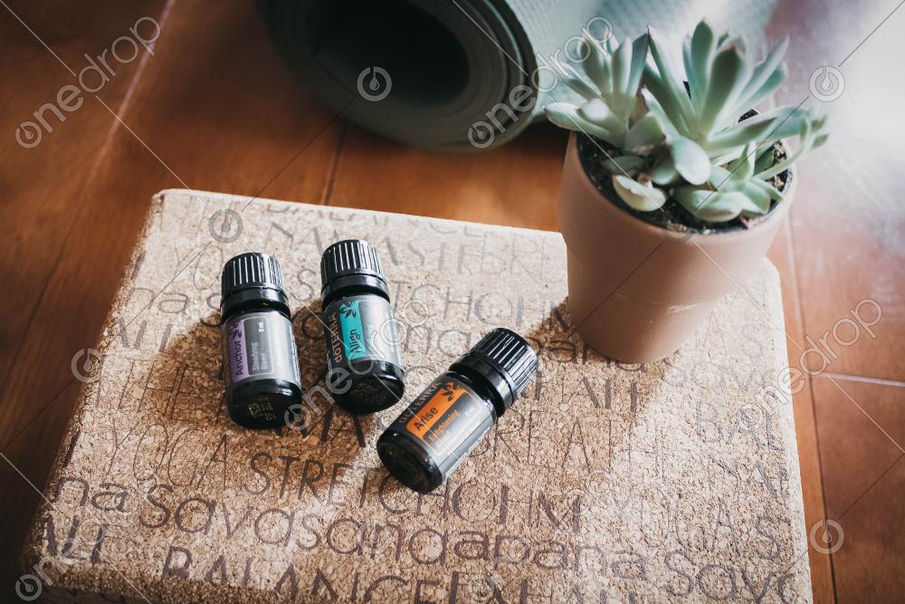 This image features 5ml bottles of Anchor, Align, and Arise with yoga block, yoga mat, and plant.