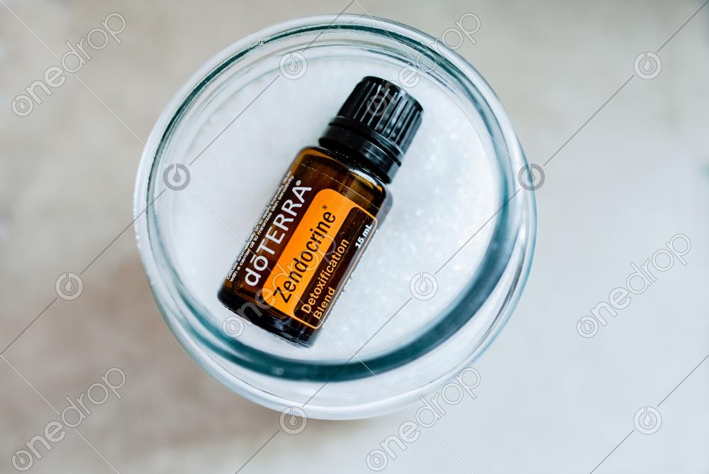This single image showcases Zendocrine Detoxification Blend in a 15mL bottle. Clean, Bright background with Epson Salt and background space to allow for any additional content/text.