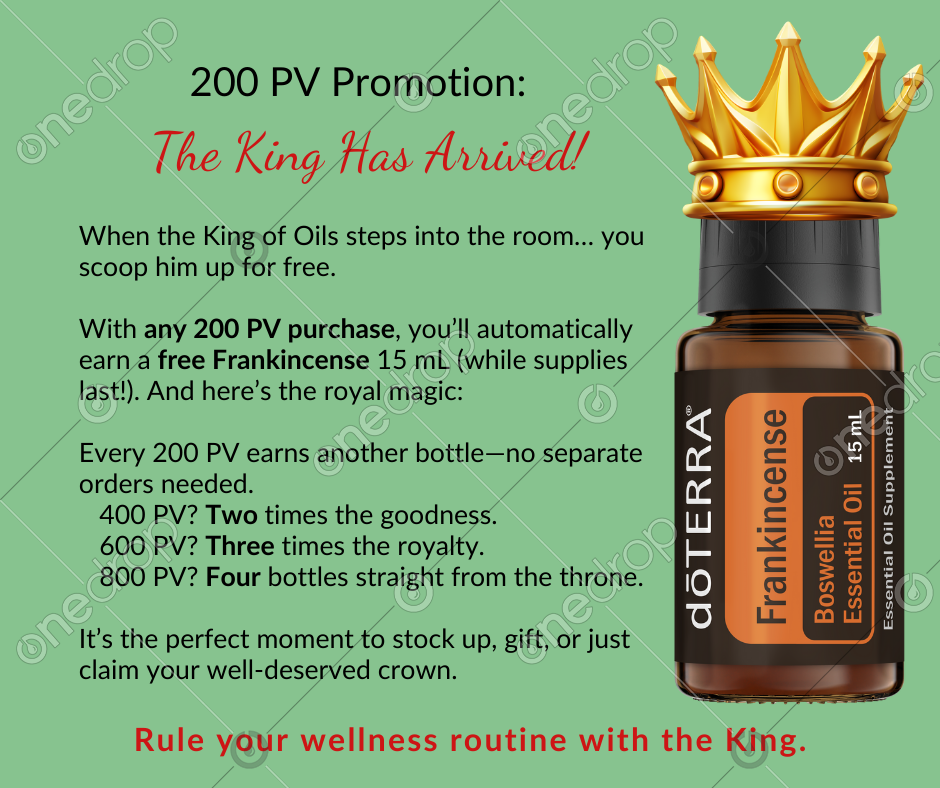 With any 200 PV purchase, you’ll automatically earn a free Frankincense 15 mL (while supplies last!).
