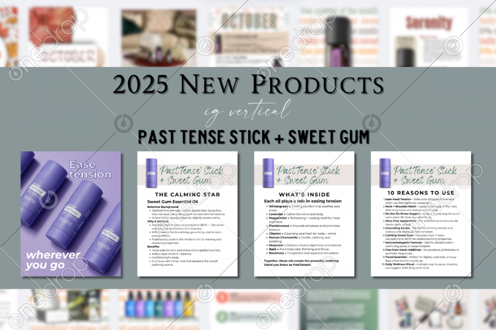 PastTense™ Stick + Sweet Gum is a mess-free, easy-to-use stick that can be conveniently applied throughout the day. It combines the classic PastTense® essential oil blend— Wintergreen, Lavender, Peppermint, Frankincense, Cilantro, Roman Chamomile, Marjoram, Basil, and Rosemary—with Sweet Gum essential oil, which is naturally high in beta- caryophyllene, a compound known for its calming properties.
