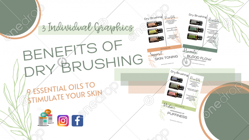 This bundle includes 3 graphics showcasing 9 essential oils to use for maximum benefits when dry brushing.