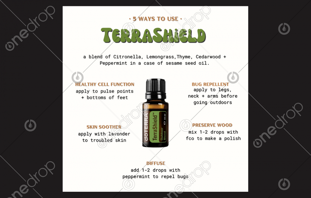 No matter the activity, you’ll want to have TerraShield on hand to keep those pesky insects away. This effective, all-natural blend combines Citronella, Lemongrass, Thyme, Cedarwood, Geranium, and Peppermint essential oils in a sesame seed oil base that can be used as a natural mosquito repellent when applied to the skin. Also available in a 30 mL spray, TerraShield is your ideal outdoor companion.