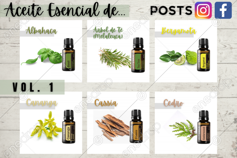 Paquete de 6 imágenes en formato cuadrado para Post de Instagram y Facebook, con un sencillo gráfico de cada Aceite Esencial junto con el Producto del cual se extrae cada uno.