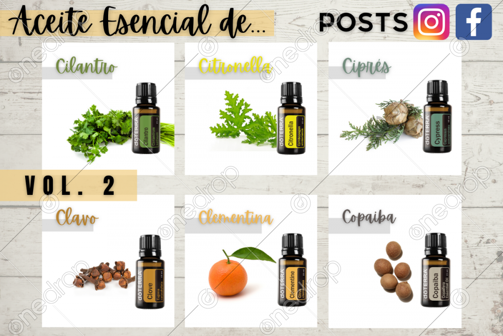 Paquete de 6 imágenes en formato cuadrado para Post de Instagram y Facebook, con un sencillo gráfico de cada Aceite Esencial junto con el Producto del cual se extrae cada uno.