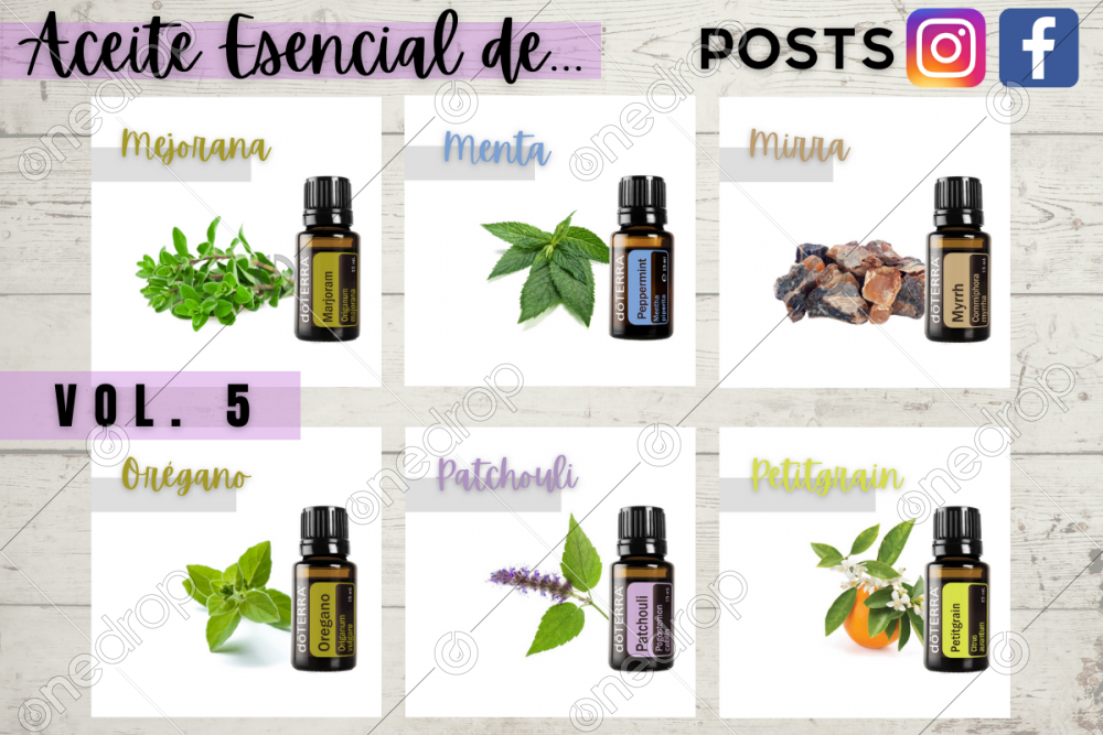 Paquete de 6 imágenes en formato cuadrado para Post de Instagram y Facebook, con un sencillo gráfico de cada Aceite Esencial junto con el Producto del cual se extrae cada uno.