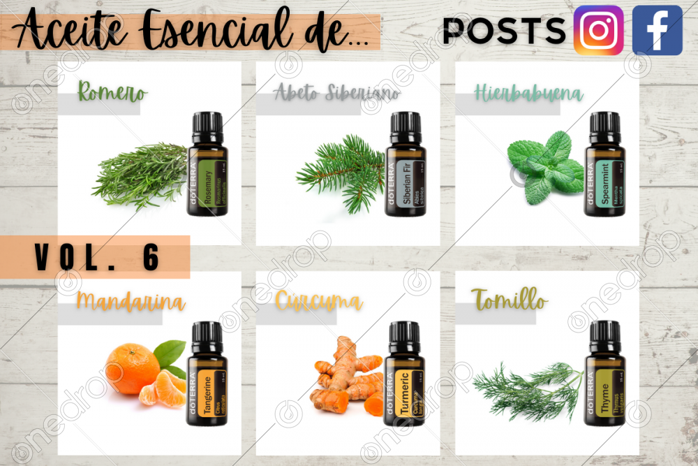 Paquete de 6 imágenes en formato cuadrado para Post de Instagram y Facebook, con un sencillo gráfico de cada Aceite Esencial junto con el Producto del cual se extrae cada uno.