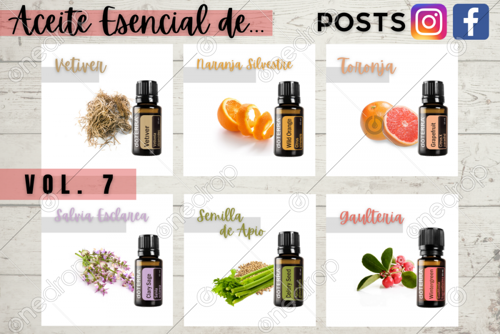 Paquete de 6 imágenes en formato cuadrado para Post de Instagram y Facebook, con un sencillo gráfico de cada Aceite Esencial junto con el Producto del cual se extrae cada uno.