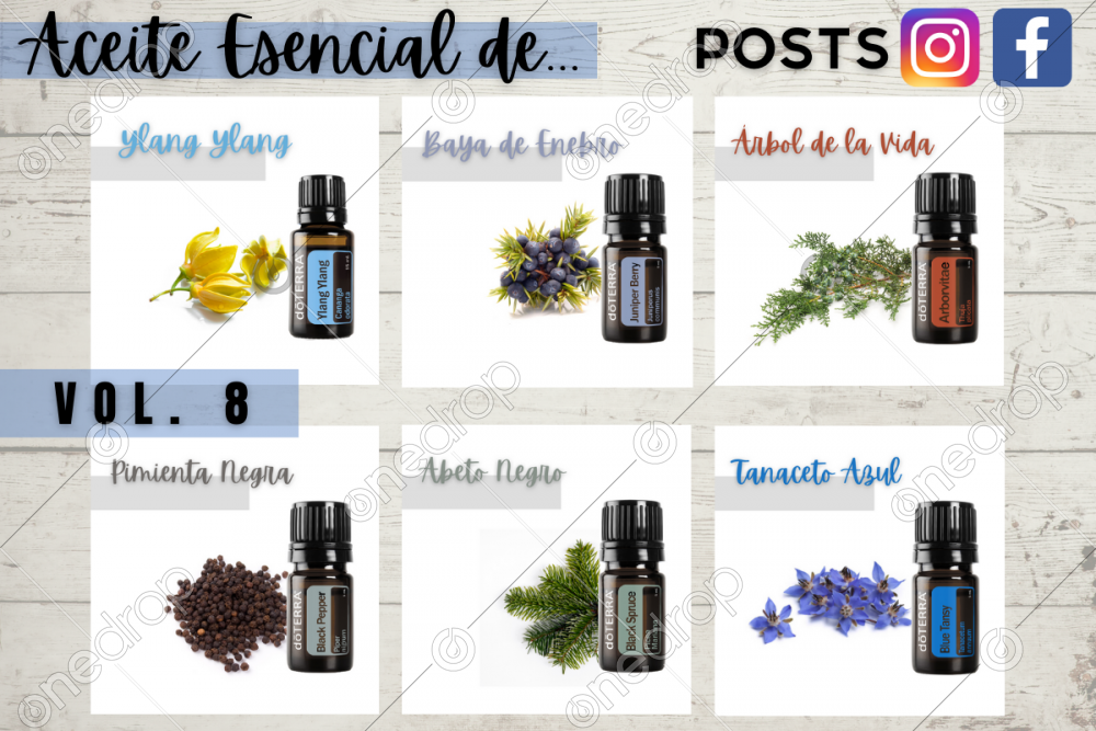 Paquete de 6 imágenes en formato cuadrado para Post de Instagram y Facebook, con un sencillo gráfico de cada Aceite Esencial junto con el Producto del cual se extrae cada uno.