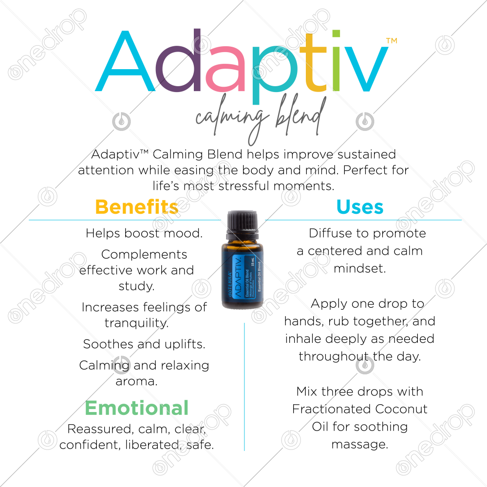 When stress and tension seem to be relentless, Adaptiv Calming Blend is the precise solution. Use Adaptiv to help get comfortable with new surroundings or situations. When a big meeting is coming up, or for other important events, keep Adaptiv Calming Blend on hand. In preliminary studies, the scent of Lavender, a main ingredient of Adaptiv, has been found to contribute to an environment conducive to performing tasks requiring sustained attention. Lavender, Magnolia, Neroli, and Sweetgum provide stress-relieving effects while Wild Orange and Spearmint energize and uplift. Copaiba and Rosemary soothe anxious feelings to round out the calming blend. Whether you’re feeling fatigued or restless, indecisive or irritable, Adaptiv Calming Blend is part of the toolbox to help the body and mind to stay balanced. Use Adaptiv Calming Blend in combination with the Adaptiv capsules for synergistic results.