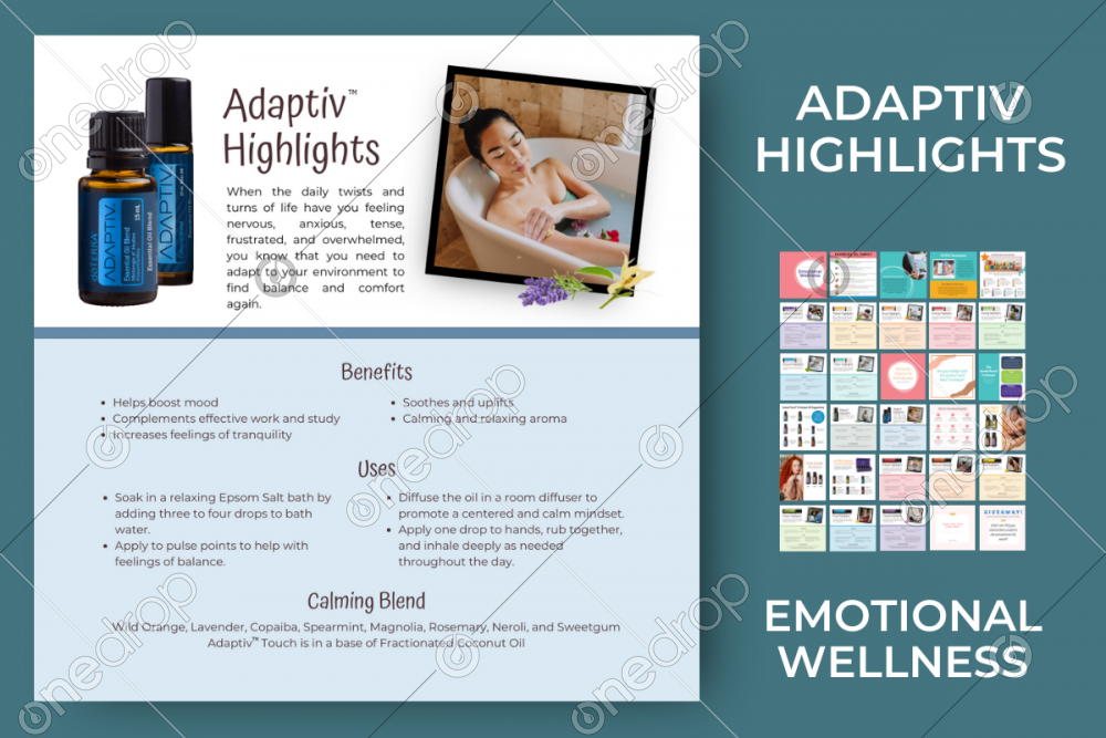 This graphic is part of the Emotional Wellness Collection with the Done-For-You-Copy. The topics include mood & oils, AromaTouch® Technique, and highlights of the Kid’s Collection and Emotional Aromatherapy® Kit essential oils. (The Done-For-You-Copy is downloaded separately). All the graphics for the collection are below!