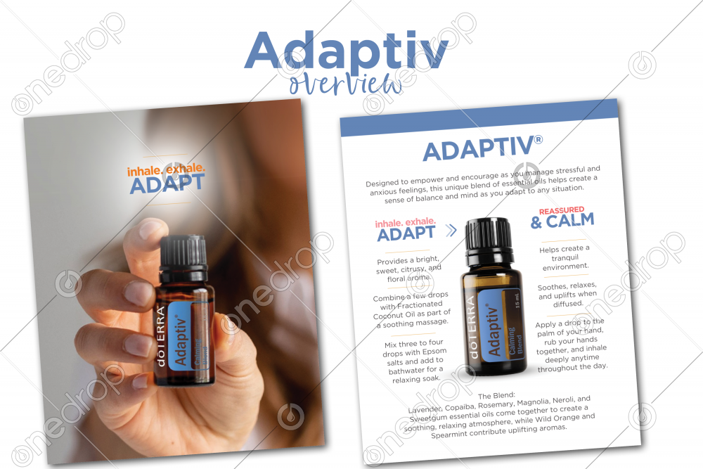 When stress and tension are high, Adaptiv Calming Blend can be a reliable tool. Diffuse it when you visit an unfamiliar place, move into a house, start a job, or need to quickly acclimate to new surroundings or situations. Whether an important meeting is coming up, you’re worried about tomorrow’s test, or Saturday’s the big day, keep Adaptiv on hand as you prepare for life’s important moments.