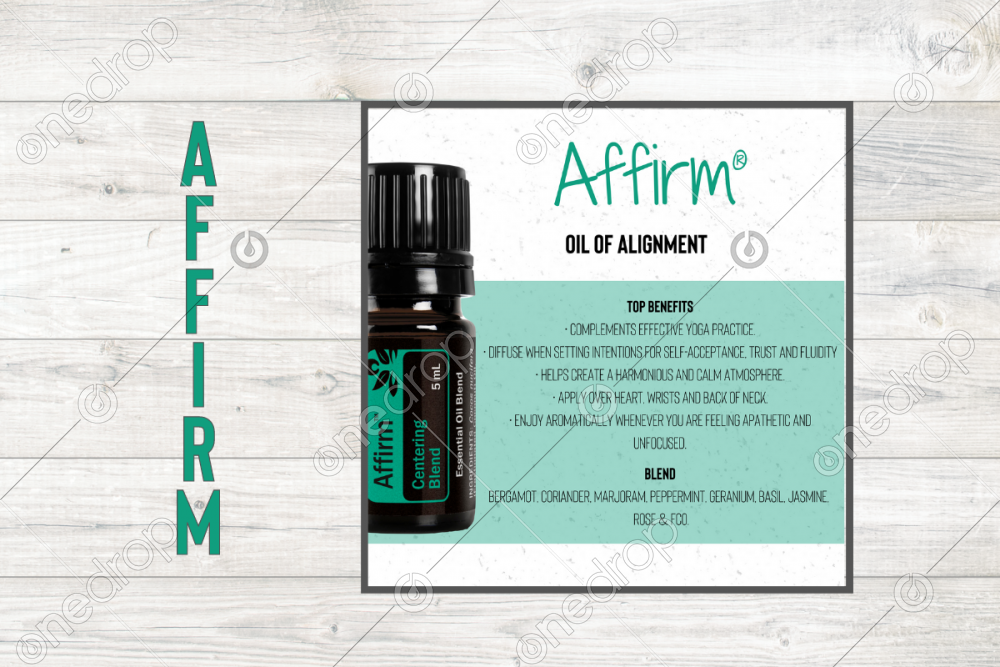 Square infographic with benefits & usage tips of Affirm Essential Oil Blend.