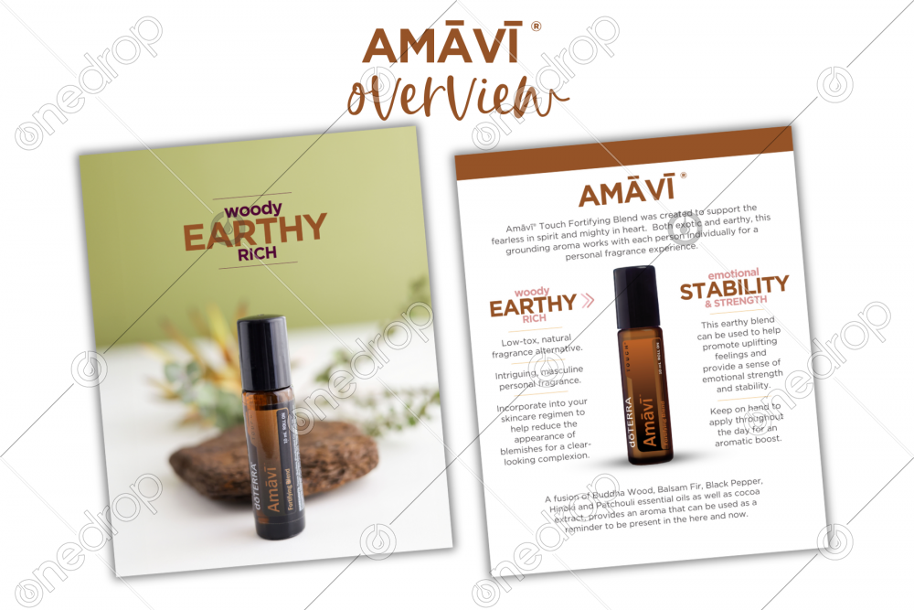 - Utilize Amavi Touch during daily practices of personal mastery or meditation. Amavi’s strong aroma helps create an environment of balance and harmony. Simply roll it onto your wrists, neck, or other pulse points and inhale during moments of reflection. Keep a bottle at your desk or roll a small amount onto the collar of your shirt to carry the grounding scent with you throughout your workday.