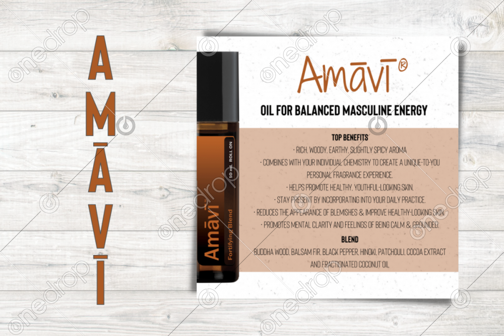 Square infographic with benefits & usage tips of Amāvī Essential Oil Blend.