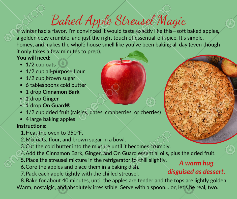 If winter had a flavor, I’m convinced it would taste exactly like this—soft baked apples, a golden cozy crumble, and just the right touch of essential-oil spice. It’s simple, homey, and makes the whole house smell like you’ve been baking all day (even though it only takes a few minutes to prep).