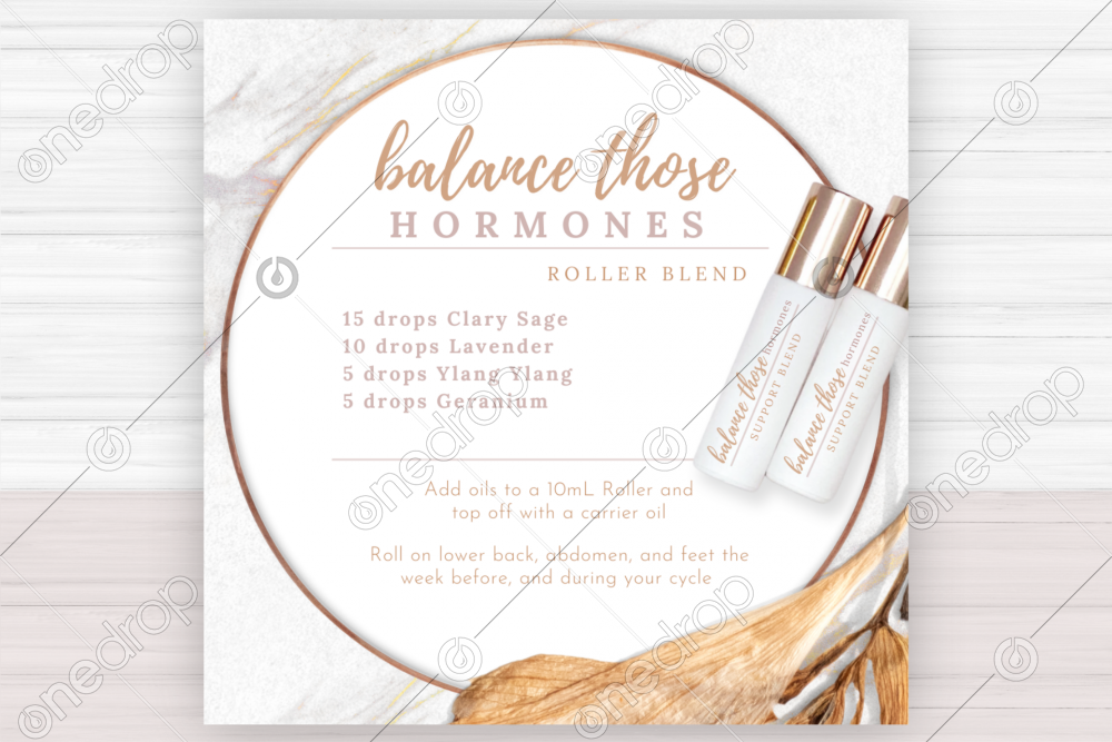 - Roller blend recipe with image of 2 white glass 10mL rollers with rose gold caps and custom labels, soft marble background, and flat-lay dried florals