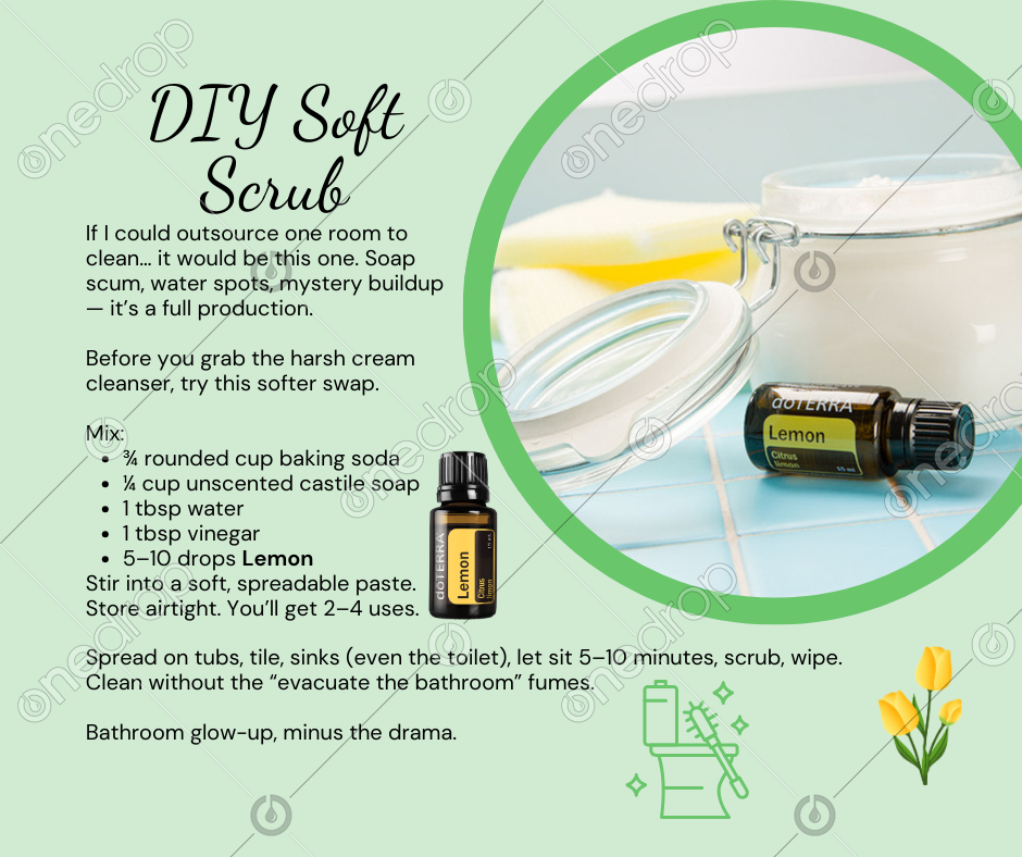 Spread on tubs, tile, sinks (even the toilet), let sit 5–10 minutes, scrub, wipe. Clean without the “evacuate the bathroom” fumes. 🙌🍋