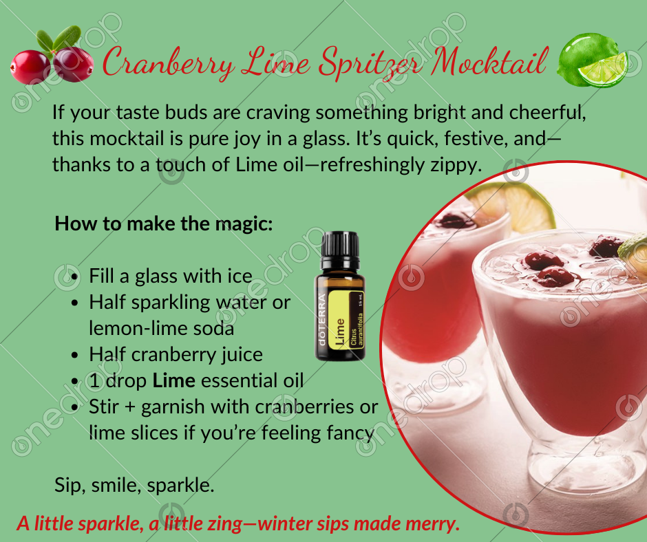 If your taste buds are craving something bright and cheerful, this mocktail is pure joy in a glass. It’s quick, festive, and—thanks to a touch of Lime oil—refreshingly zippy.