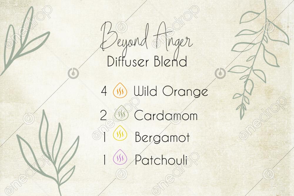 A diffuser blend recipe to ease emotions of anger. Calming images on a textured background complement the text.