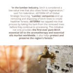 "In the lumber industry, birch is considered a low-value tree that also slows forest regeneration," said Tim Valentiner, dōTERRA VP of Global Strategic Sourcing. "Lumber companies end up removing and disposing of birch trees to create healthier forests. dōTERRA has tapped into that process by taking the bark from the removed trees before they continue to processing. This initiative not only provides the first ever pure Birch essential oil to the aromatherapy and essential oils market worldwide, it also helps protect and preserve the region's forests."