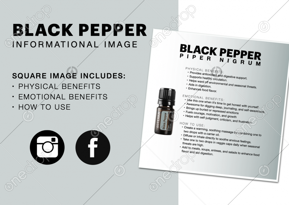 Square Social Media Image with Physical Benefits, Emotional Benefits + How to Use for Black Pepper essential Oil