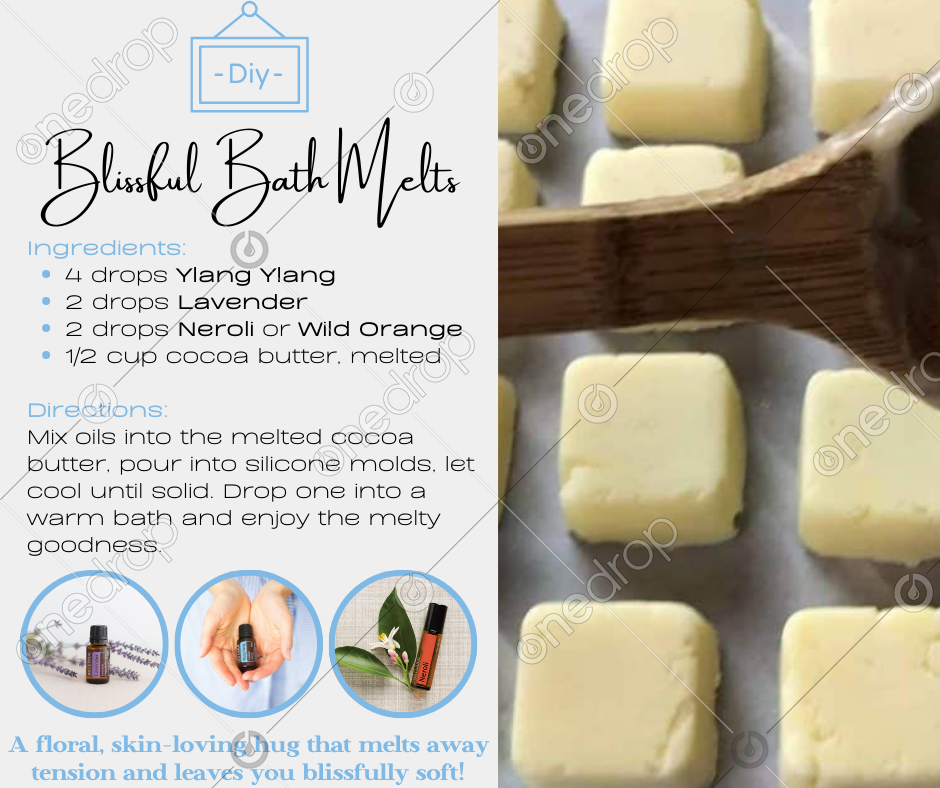 ✨ Mix oils into the melted cocoa butter, pour into silicone molds, let cool until solid. Drop one into a warm bath and enjoy the melty goodness.