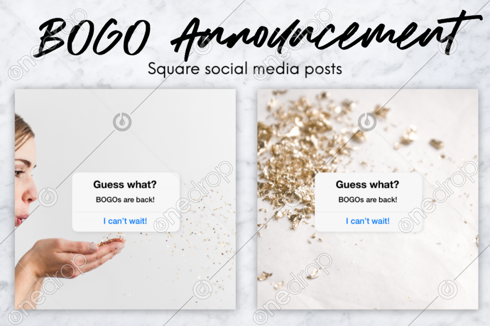 Two square BOGO Announcement text message style square graphics, perfect for social media posts