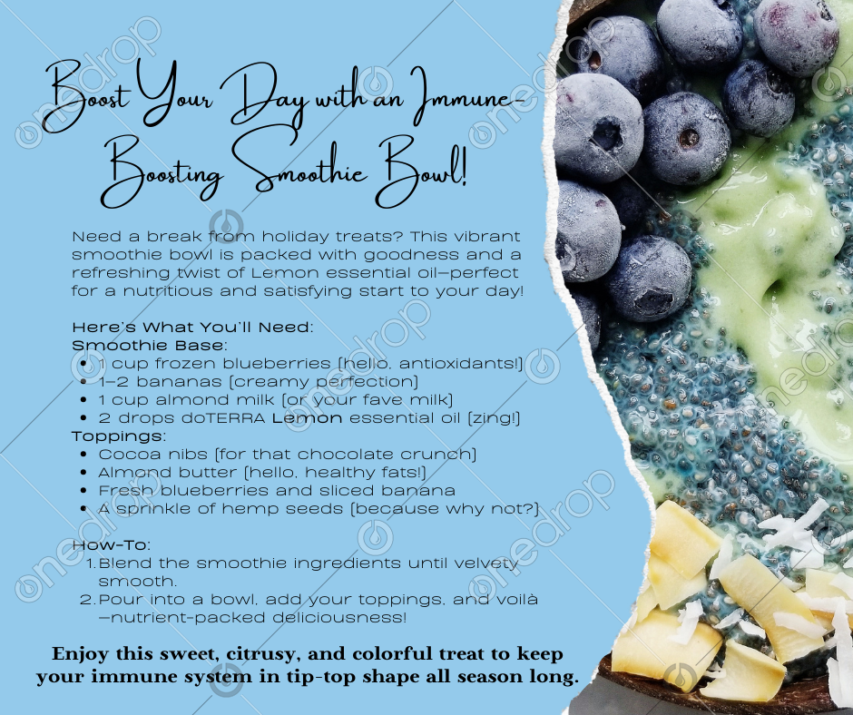 Need a break from holiday treats? This vibrant smoothie bowl is packed with goodness and a refreshing twist of Lemon essential oil—perfect for a nutritious and satisfying start to your day!