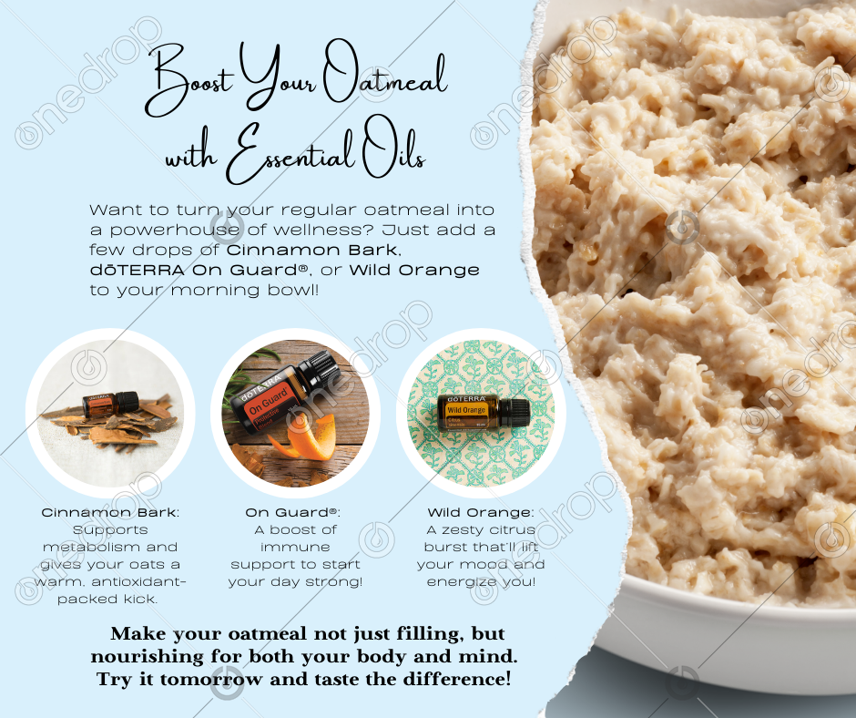Want to turn your regular oatmeal into a powerhouse of wellness? Just add a few drops of Cinnamon Bark, dōTERRA On Guard®, or Wild Orange to your morning bowl! 😋✨