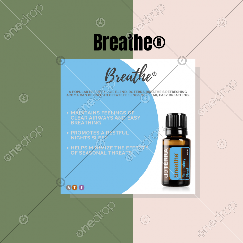 doTERRA Breathe is a remarkable blend of essential oils including Laurel Leaf, Peppermint, Eucalyptus, Melaleuca, Lemon, Cardamom, Ravintsara, and Ravensara. doTERRA Breathe maintains feelings of clear airways and easy breathing while minimizing the effects of seasonal threats. doTERRA Breathe can be applied topically to the chest, back, or bottom of feet, or diffused at nighttime to calm the senses and promote a restful sleep.